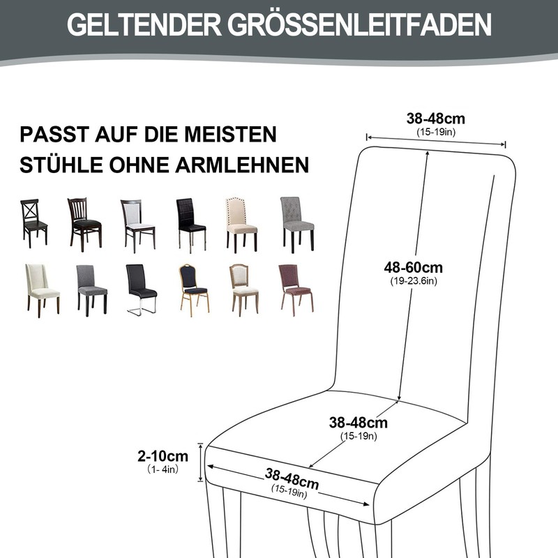 - Universal size chair cover: made of highly elastic fabric. Suitable for most chairs without armrests. Back height 48-60 cm, back width 38-48 cm, seat length 38-48 cm, seat width 38-48 cm, seat thickness 2-10 cm. Please measure the dimensions of the chair and compare them before purchasing. Due to manual measurement, the size may have 1-2 cm error. Please note: chair cover only, chairs are not included.