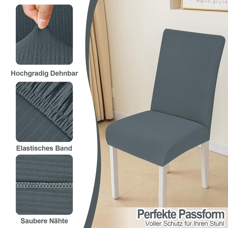 Hidden elastic band gives the cover a good grip on many different chairs. Dining chair cover is made of soft and highly elastic polyester and elastane. Soft grip and comfortable, breathable, durable and wrinkle resistant.
