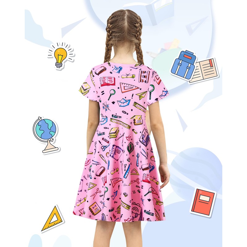 ALISISTER Little Size 5 Girls Back to School Dress Pencils Notebooks Dresses Party Outfits Short Sleeve Twirl Sundress Pink