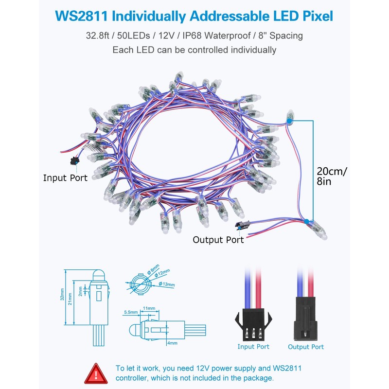 - 【Individually addressable LED 】 This is digitally-addressable WS2811 LED pixel string lights. Per string has 50pcs F8 RGB LED chips and WS2811 smart IC. You can set the color of each LED and their brightness individually! 256-level brightness and 24-bit color display, achieve 16777216 colors full color display.(8inch spacing)