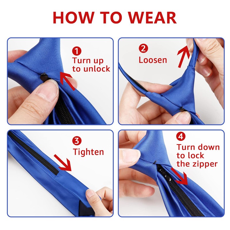 • If you want to tighten the tie, just to close it. When the zipper is up, you can loosen the tie. When the zip is pressed down, the tie is fixed