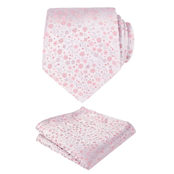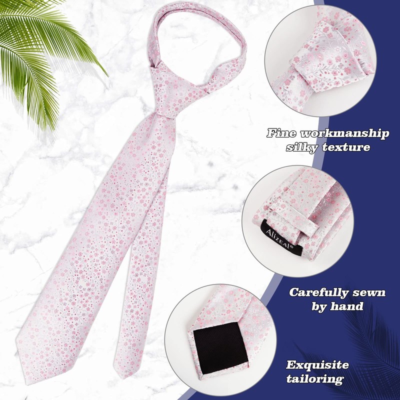 Alizeal Mens Floral Pattern Tie with Flower Printed Pocket Square 3.15inches Colorful Tie Set, Light Pink