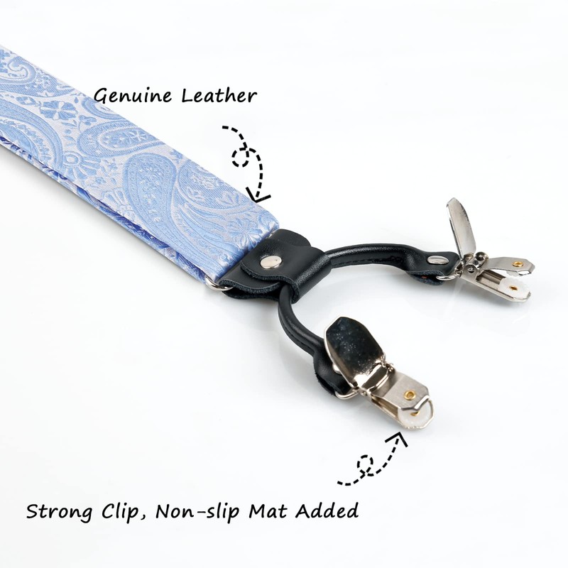 - Tamaño: el ancho del tirante es de 3,5 cm, la longitud ajustable y la parte trasera es elástica, longitud total de hasta 58 pulgadas (incluye la longitud de los clips). La pajarita mide 12 x 6,5 cm para el tamaño del cuello. El cuadrado de bolsillo mide 25 x 25 cm