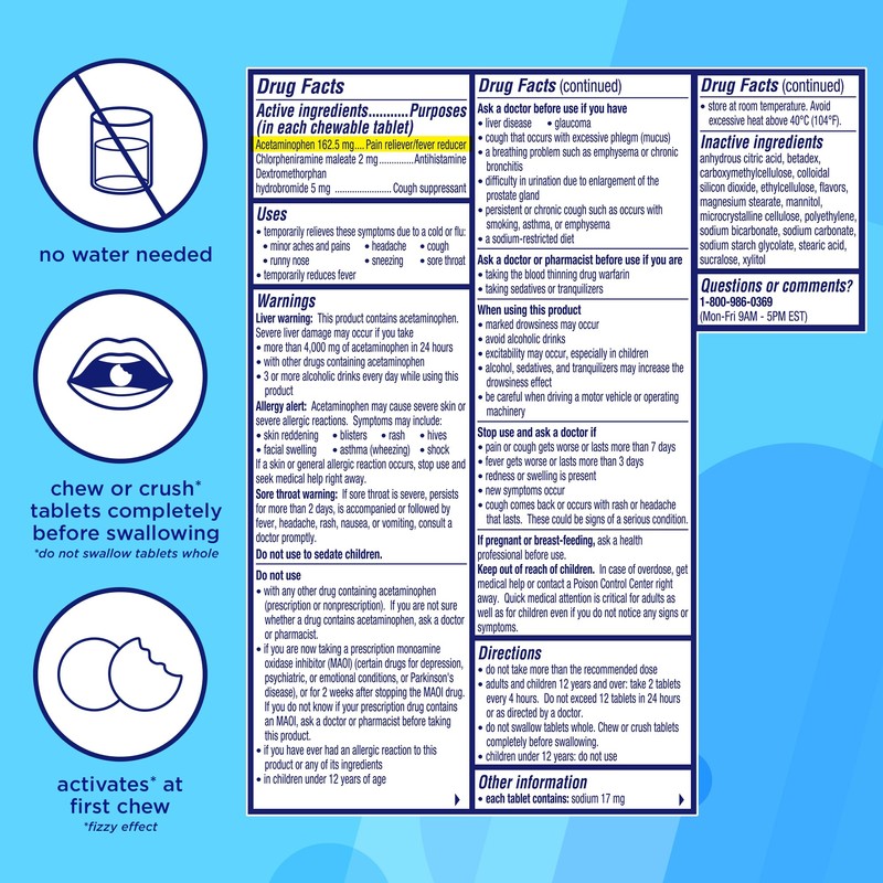 - On the go relief: These cold and flu chewable tablets activate without water, makingthem a great option to grab and go
