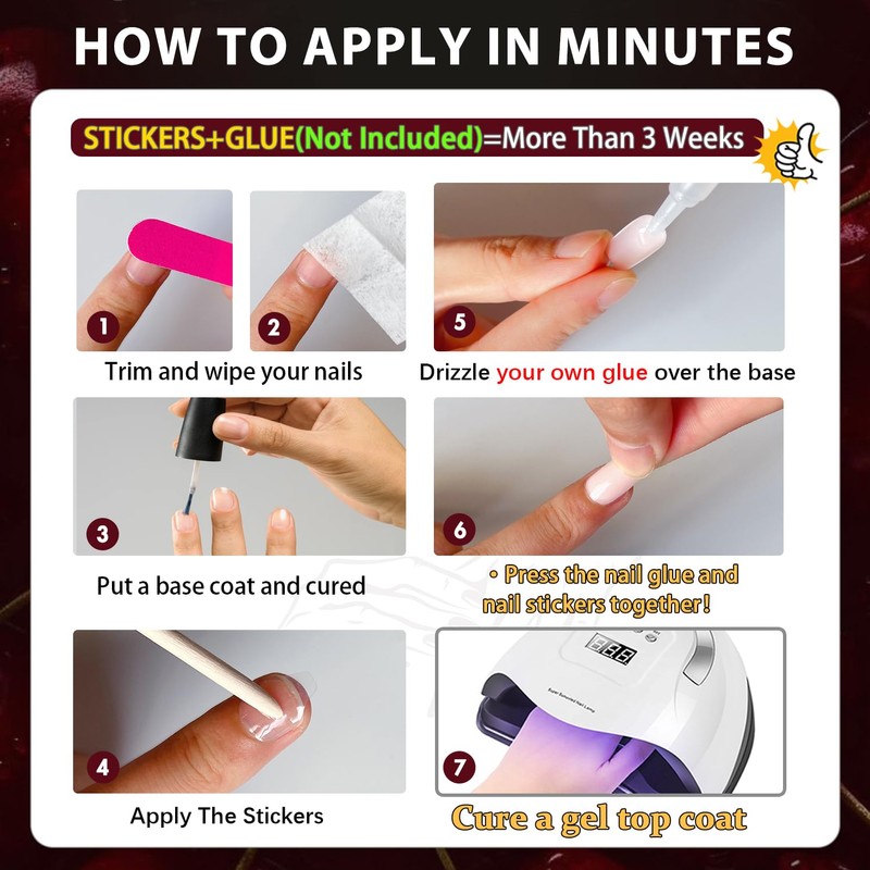 2.Please note that the nail glue is not included.If you want it last for a longer time,please use nail glue instead of the nail stickers.