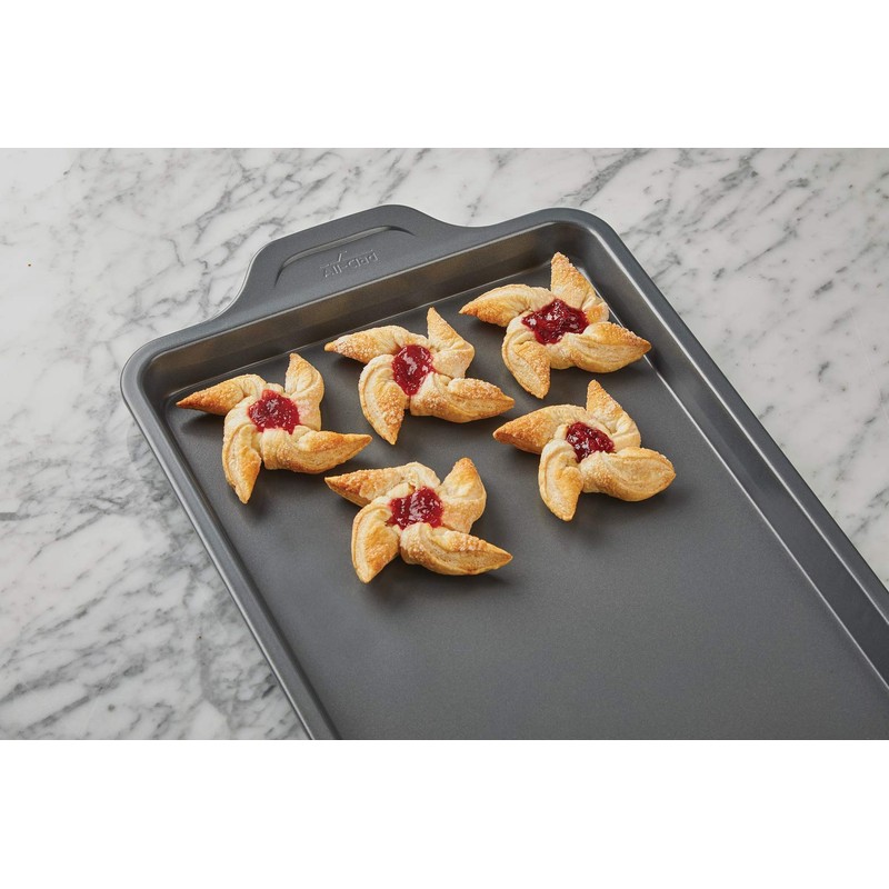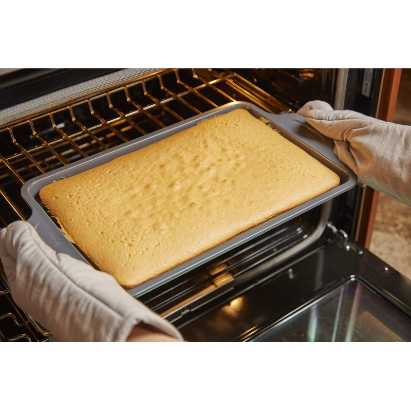 Sheet pans are essential pieces for any passionate baker, from budding to professional, and this jelly roll pan is no exception. With 1" High rims and standard jelly roll Dimensions, this pan lives up to its namesake for recipes that explicitly call for this size, such as a Swiss roll cake or holiday bûche de noël. Oversized handles allow for a safe grip of the pan, even while wearing mitts. The durable ceramic-reinforced fat-free nonstick finish is specially designed for baking, releasing moist cakes, gooey cookies, and sticky treats with ease, batch after batch. Follow recipe instructions, greasing as directed, but avoid cooking spray as it can damage the nonstick coating.