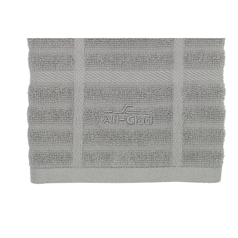 **Product Description** All-Clad Textiles 100-percent Combed Terry Loop Cotton Solid Kitchen Towels in Titanium are engineered with a unique woven technology for extra reach into corners and crevices of cookware, dishes and glasses. Treated with an anti- microbial agent to inhibit the growth of bacterial odors and to extend the useful life of the towel by controlling deterioration caused by mildew. Oversize, measuring 17" x 30", this towel is large, absorbent, ultra soft, and made to last.