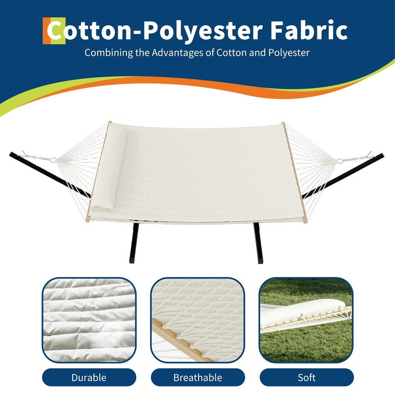 All-Season Double Hammock with Stand – Heavys Duty 475 Lbs Capacity, Ultra-Comfortable Cotton Rope & Quick-Dry Pad – Perfect for Backyard, Camping, or Indoor Lounging, Beige