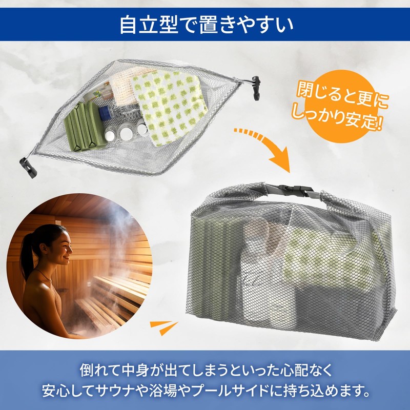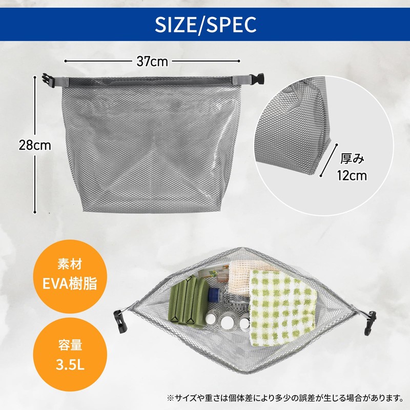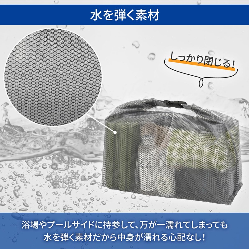 - It is not a mesh material, and is made of waterproof EVA resin material like vinyl, so it is easy to repel water droplets, so you can store wet items in sauna or hot springs and bring them home