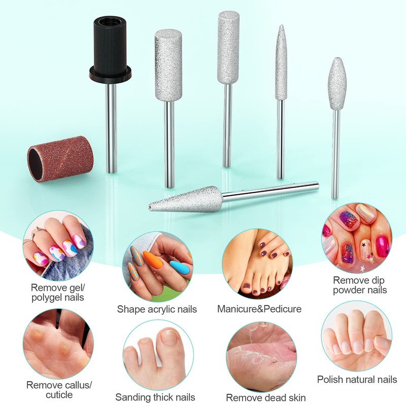 - JUEGO COMPLETO DE BROCAS: El taladro para uñas Alles viene con una broca con cabeza de aguja, una broca de seguridad, una broca cónica, un cilindro grande y pequeño y un mandril, lo que facilita el cambio de las brocas sin herramientas. Solo asegúrese de empujar las brocas completamente hacia abajo de forma segura para evitar que se muevan.