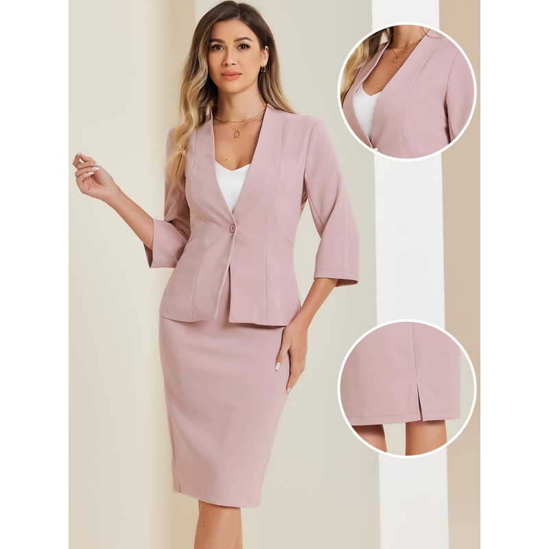 - This Elegant Skirt Suit Set is Made Up of Several Design Points: Blazer: One Button, Collarless, 3/4 Sleeve; Pencil Skirt: High Waist, Back Slit at Hem, Below the Knee