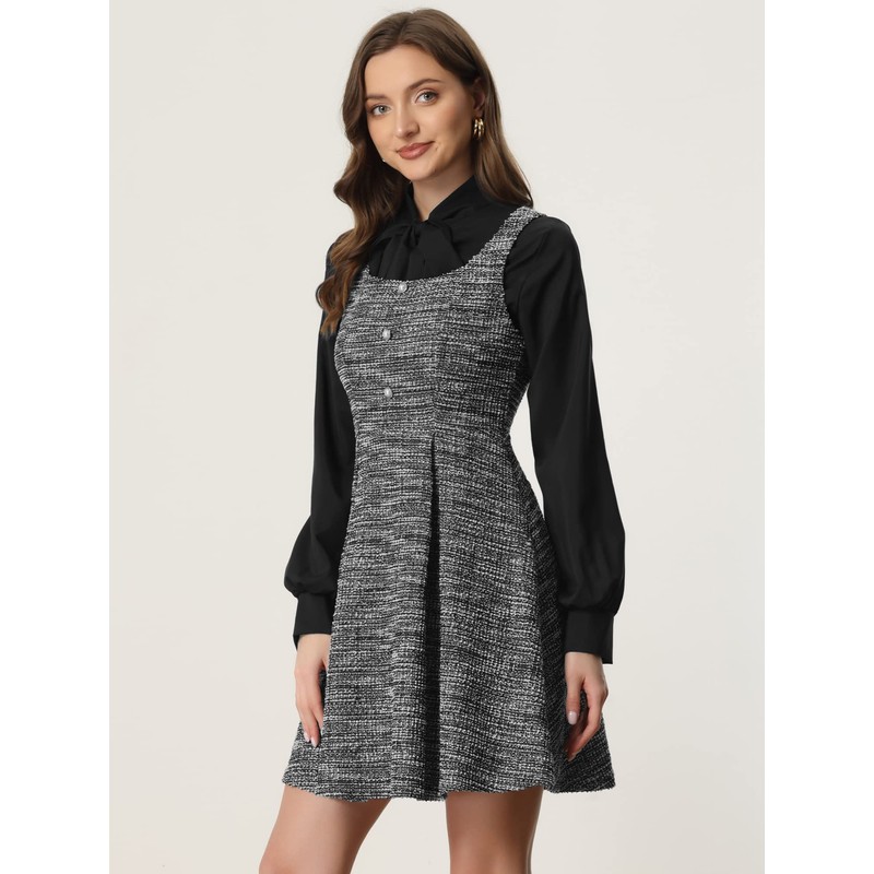 Allegra K Tweed Dress for Women's Pinafore Overall Sleeveless A-Line Plaid Tank Dresses Medium Black