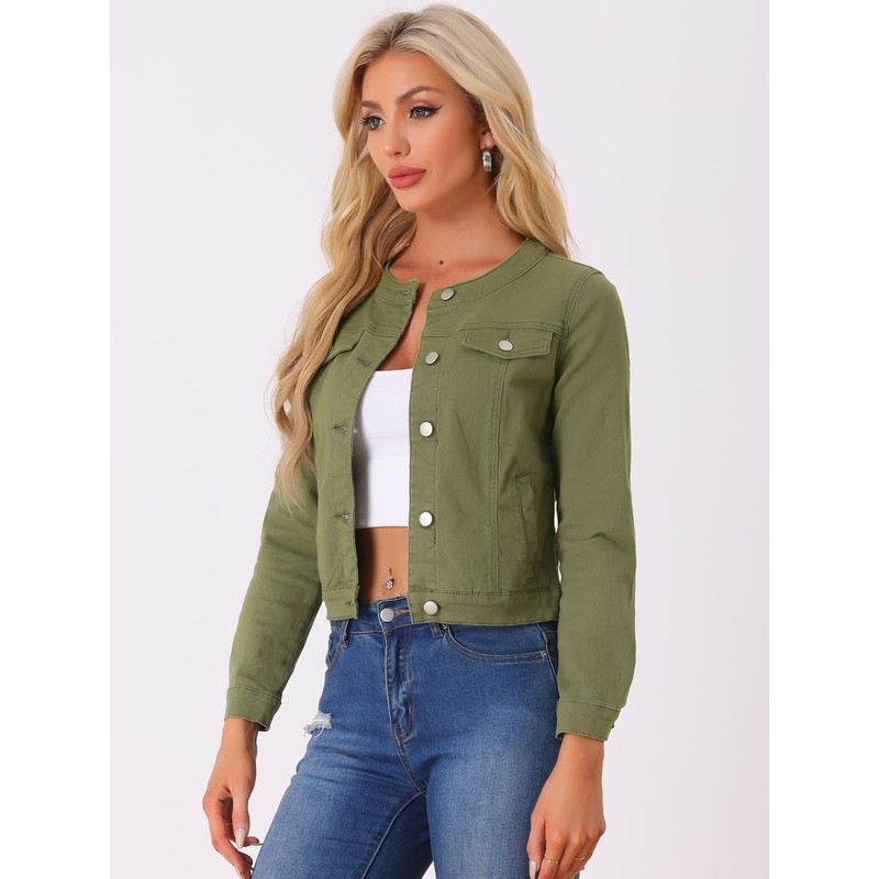 Allegra K Women's Denim Jacket Collarless Round Neck Button Down Long Sleeve Jean Jackets Medium Army Green