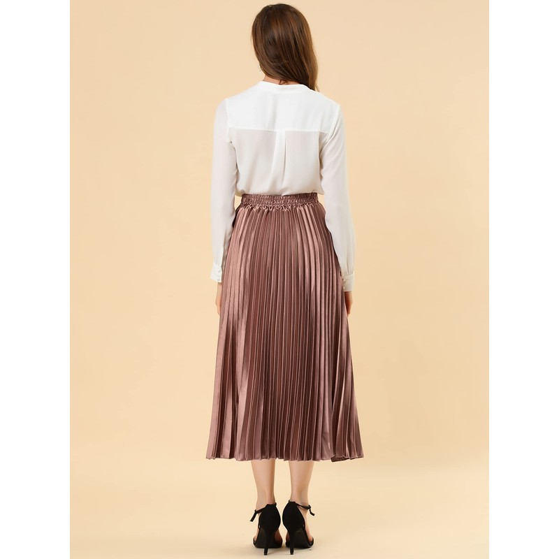 Allegra K Women's Elastic Waist Party Metallic Shiny Accordion Pleated Midi Skirt Copper L
