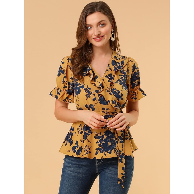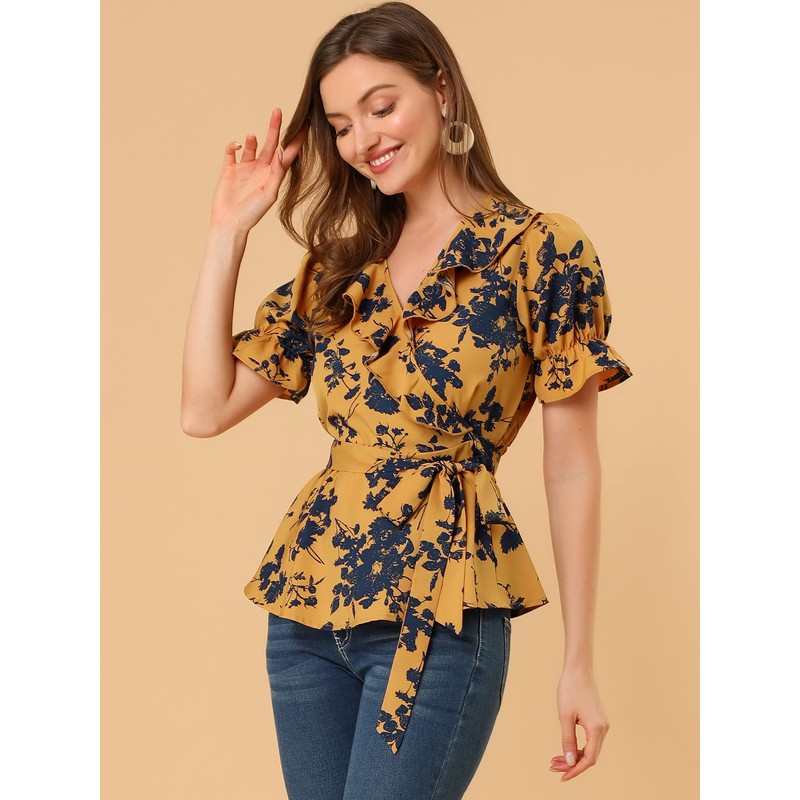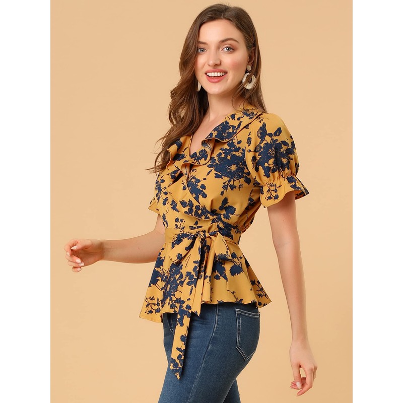 Allegra K Women's Wrap Peplum Top Blouse 2025 Summer Floral Short Sleeve Ruffle V Neck Belted Shirts Medium Yellow