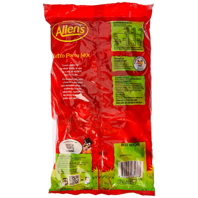 • Contains funny teeth, tangy pineapples, green racing cars, juicy strawberries and cream, creamy milk bottles, chewy raspberries, luscious lips, honey bears, cool cola bottles and retro man