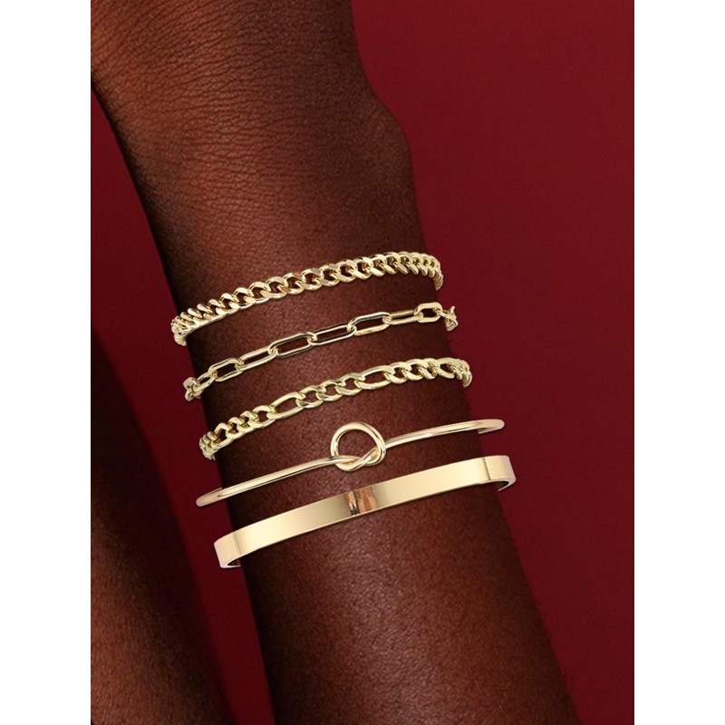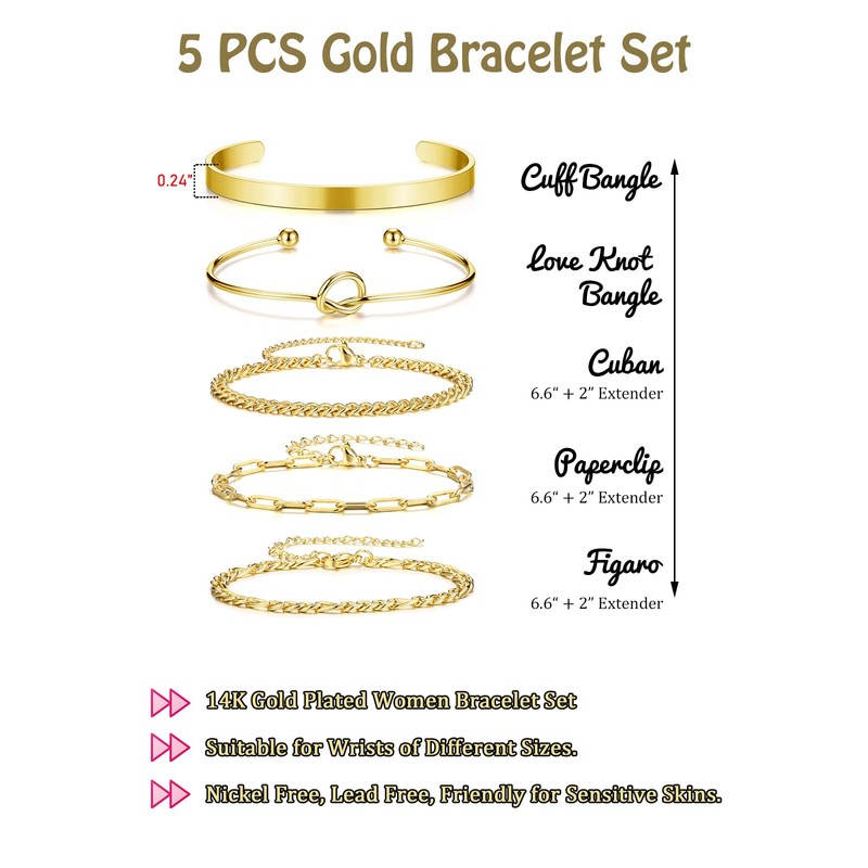 these 5pcs gold bracelets is made of stainless steel, sturdy and durable, lead-free, nickel-free and hypoallergenic, friendly to sensitive skin. Women’s 14K gold bracelets include gold cuff bangle, gold knot cuff bangle, gold paperclip chain gold figaro chain and gold cuban chain, multi style gold bracelets meet your needs, classic and fashionable layered chain bracelet design; perfect for women and girl’s daily wear or holiday dress, you can match with your other jewelry, easily to complete your look. It will look great no matter what the occasion.