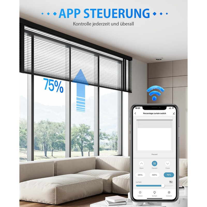 - PROZENTUALE STEUERUNG - Die APP-Steuerungsoberfläche zeigt den aktuellen Status der Vorhänge in Echtzeit an. Mit dem leicht verständlichen Tutorial-Video, um die Vorhang-Kalibrierung leicht abzuschließen, können Sie 1%-100% genaue Kontrolle erreichen.