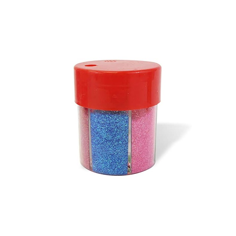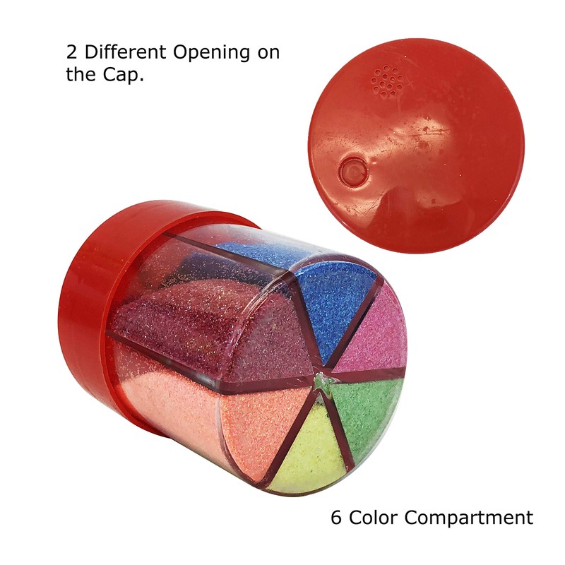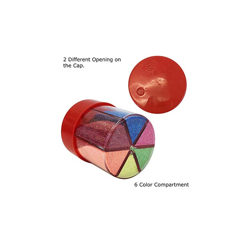 - 6 compartment containr 6 different color of glitter. Easy to take with you, or organize along with your other art n craft supplies.