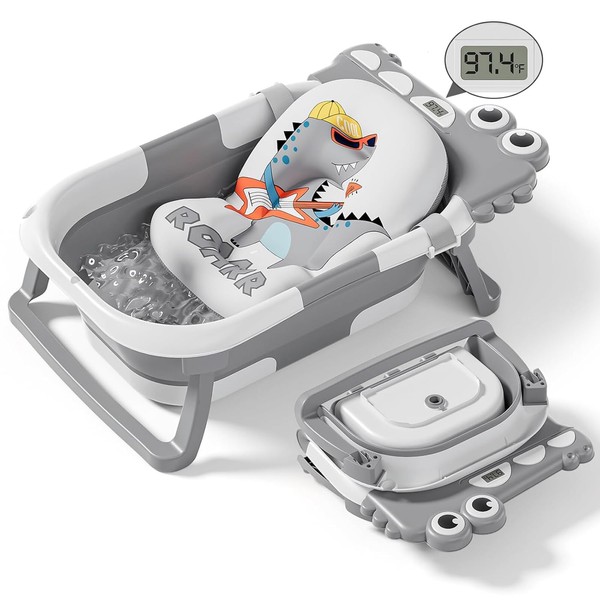 Collapsible Baby Bathtub for Newborn, Foldable Baby Bath Tub with Thermometer & Soft Floating Cushion & Drain Hole, Portable Travel Infant Bath Tubs for Newborns to Toddlers 0-36 Months Boys, Grey