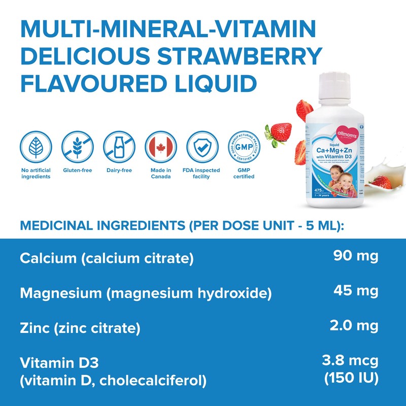 - Liquid Formula That Includes All- Calcium, Magnesium, Zinc and Vitamin D. These minerals and vitamins are essential for your KID'S GROWTH, STRONG BONES, and to strengthen the immune system. The liquid form ensures the delicate system absorbs it well.