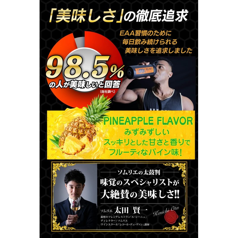 - 【開発ストーリー】商品設計の段階から現役のトップフィジーク選手を中心としたプロジェクトチームを発足させて1年3ヶ月の歳月をかけて開発しました。トレーニーが飲みたい、飲み続けれれるEAAにするために成分、配合、味に関してトップフィジーク選手の意見を徹底的にヒアリングしました。成分、配合、味、どれも妥協のないEAAです。