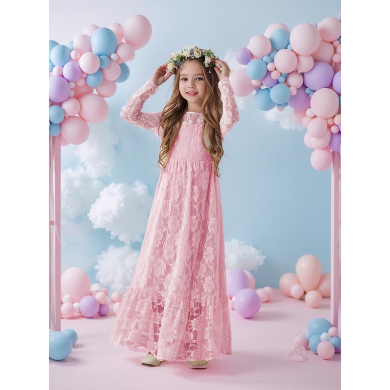 ALLOVIN Long Sleeve Boho Lace Flower Girl Dress, A-Line Ruffle Wedding Baptism Party Dress for Girls 3-12 Years | Pink | 8-9Y