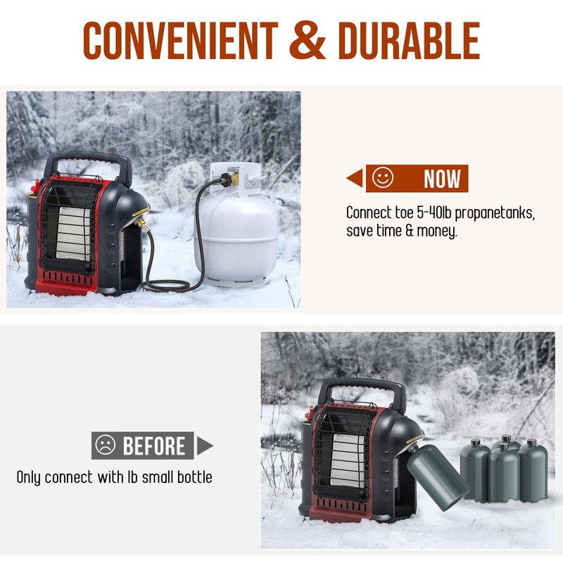 - Easy to Install within 2 Minutes, No Tools Needed — The heavy-duty brass fittings are precisely designed to ensure easy connection. Hand tighten the brass connectors to finish the installment, taking less than two minutes. Our 1lb to 20lb propane tank adapter with 5ft length provides larger space to set up your appliance and propane tank, increasing flexibility and safety.