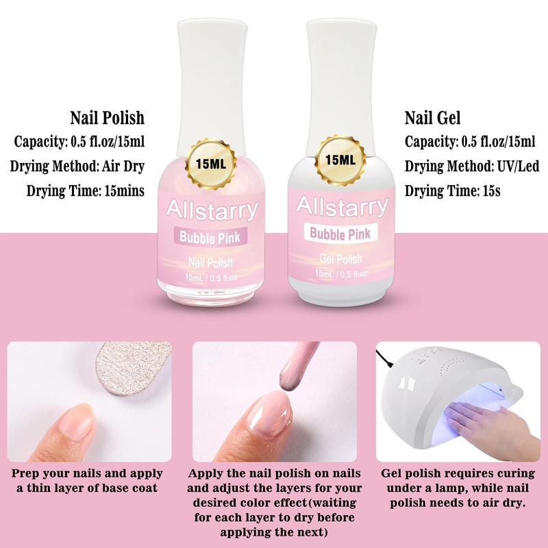 - Perfectly Combined - Suitable combination of air dry light pink nail polish and LED/UV pink gel polish allows you to effortlessly enjoy the benefits of both. Air dry fingernail polish eliminates the waiting time, ideal for quick valentines nails. UV/LED nail gel provides strong and durable effect by forming a protective layer on nails, preventing chipping, scratching or color fading on gel nail colors. Suited for long-lasting and flawless nails.