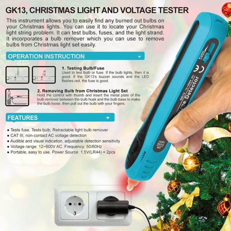 - 【NON-CONTACT AC VOLTAGE DETECTION】Mini Christmas Light Tester is non-contact AC voltage detection, used as a 12V to 600V AC power tester, allows you to easily find any burned out bulbs on your Christmas lights.Power Supplied by 2 pieces 1.5V LR44 button cells.If you have any issues, check the batteries.