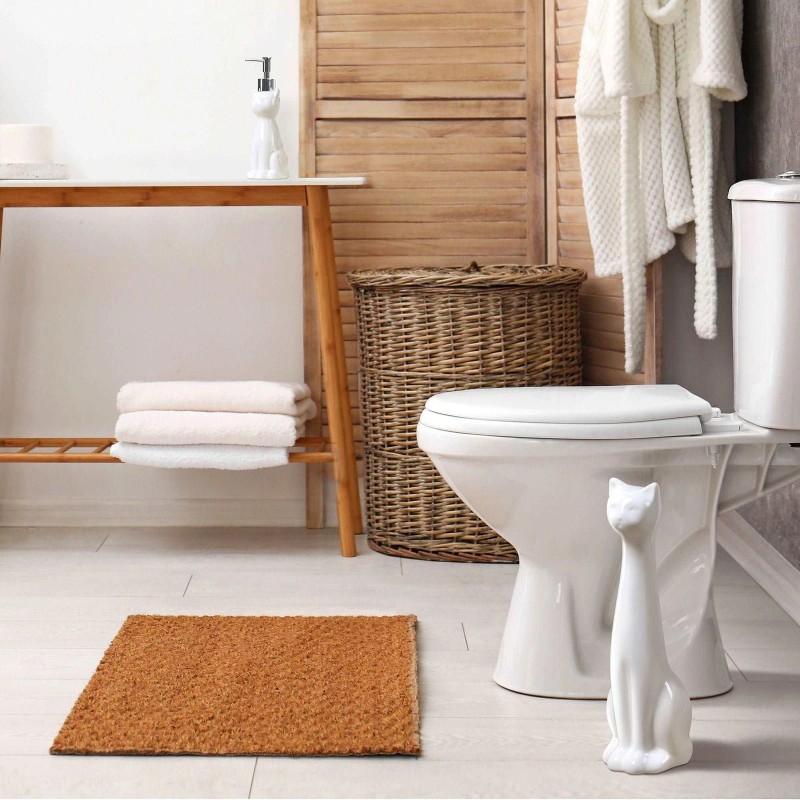 Add a touch of whimsical charm to your bathroom with our Cat Ceramic Toilet Brush Holder with Brush and Soap Dispenser 3-Piece Set White. The set includes a white ceramic cat brush holder, plastic handled brush and matching white ceramic cat soap dispenser with a tall plastic pump head in shiny chrome. The graceful long neck of the holder helps to discreetly store and hide the toilet brush until you are ready to use it. The dispenser has a removable push down pump for one touch dispensing of your favorite liquid soap or lotion. This set is the perfect decoration for cat lovers. Hand wash.