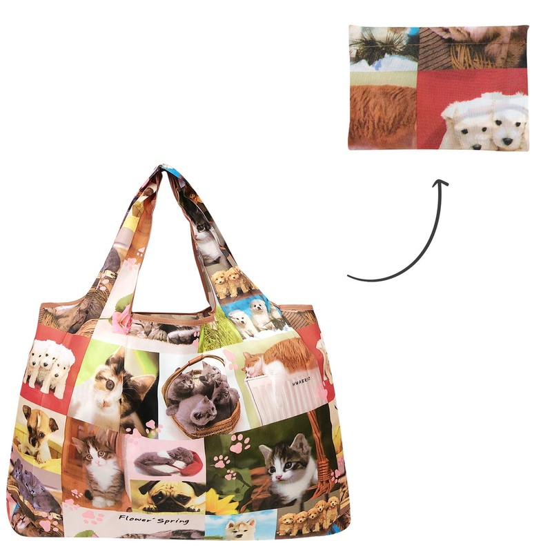 Allydrew Large Foldable Tote Nylon Reusable Grocery Bags, 3 Pack, Kitties & Puppies