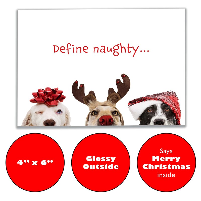 - GIGGLE INDUCING: Featuring mischievous pups, these Christmas cards are guaranteed to make your friends and family members burst into laughter.