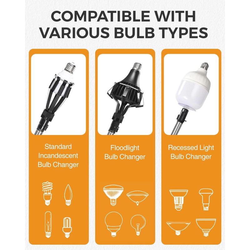• 【Comprehensive Bulb Changer Kit】 This kit includes 9 poles, a large 8-finger cage, a small 8-finger cage, and a suction cup, compatible with standard, medium, and large LED bulbs. The three interchangeable adapters ensure you can effortlessly meet all your daily bulb replacement needs, accommodating various bulb types.