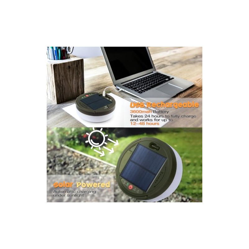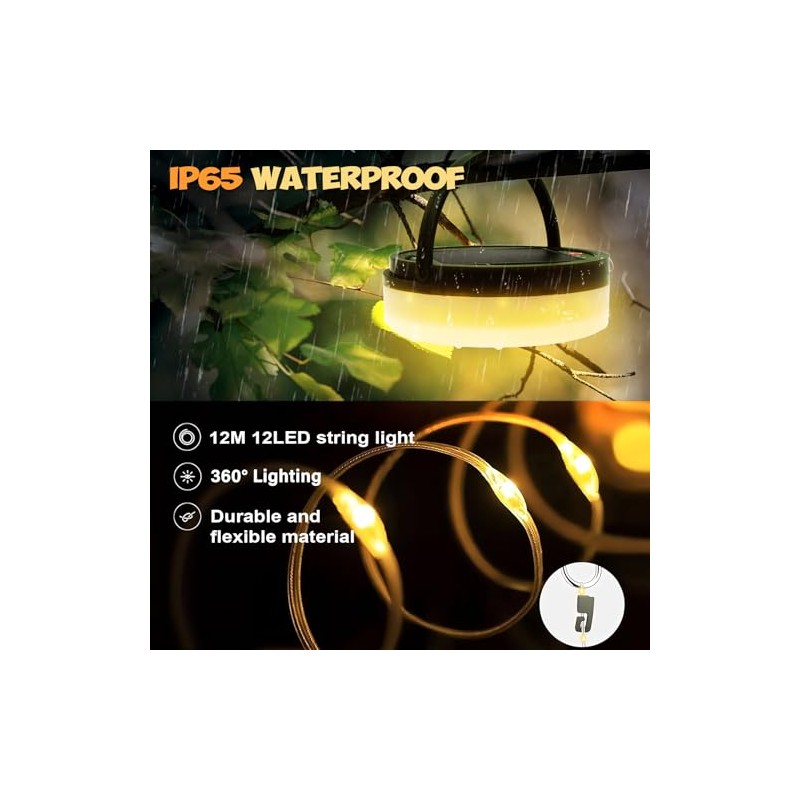 • ?IP65 Waterproof Stowable String Lights SolarThis solar camping string light is made of high quality copper wire and rubber, highly flexible and durable, easy to bend and fold. The camping night light can provide up to 3000K soft and bright warm white light illumination to light up your outdoor adventure. IP65 waterproof function makes it adaptable to various outdoor conditions.