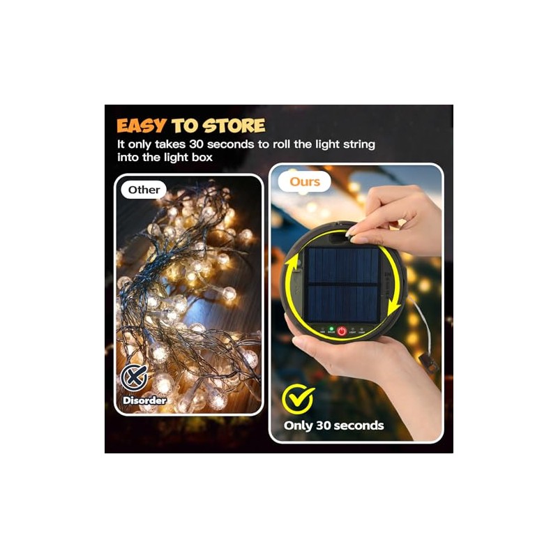 • ??Easy to Store and CarryQuickly rotate the handle and organize the light string in just 30 seconds. The outdoor stowable string light has a compact design and weighs only 0.58 pounds, which is very portable and space-saving. It fits effortlessly into your backpack and and ready to start your journey. This retractable camping light string is ideal for camping, fishing, patio, hiking and other activities; also ideal as a gift for family and friends.