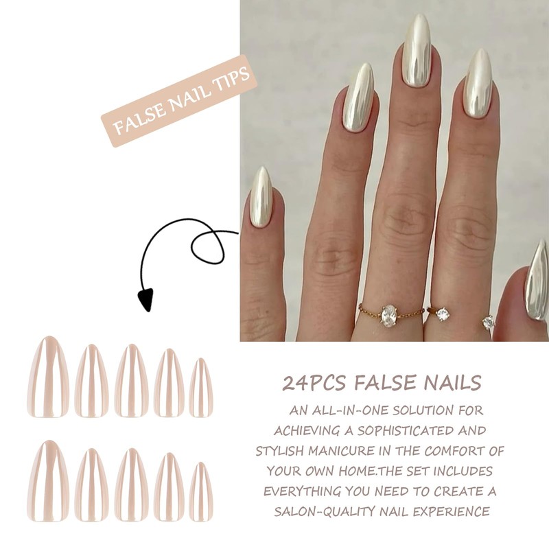 - 【French Design】These nail fake nails are adapts Pearl White Chrome Design, embellished with Almond shaped, make it looks elegant and nature that help you to express confidence in your daily life and work. Great options for home DIY manicure and urgent appointment.
