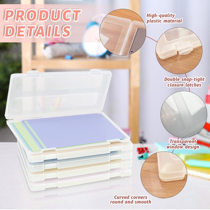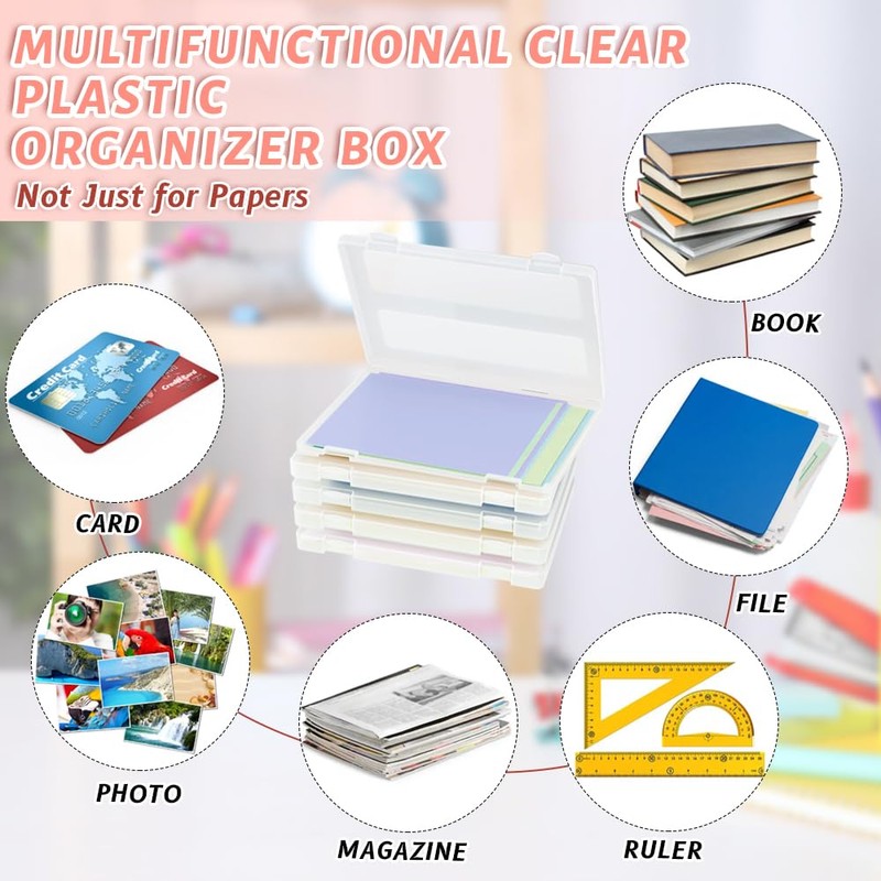 ALMOXVYE 5 Pack Portable Project Case, Plastic Paper Case for 8.5 x 11 Inch Letter A4 File Paper, Scrapbook Paper Storage Boxes for Photo, Document, Magazine, Stamps, Envelopes, Office School Supplies