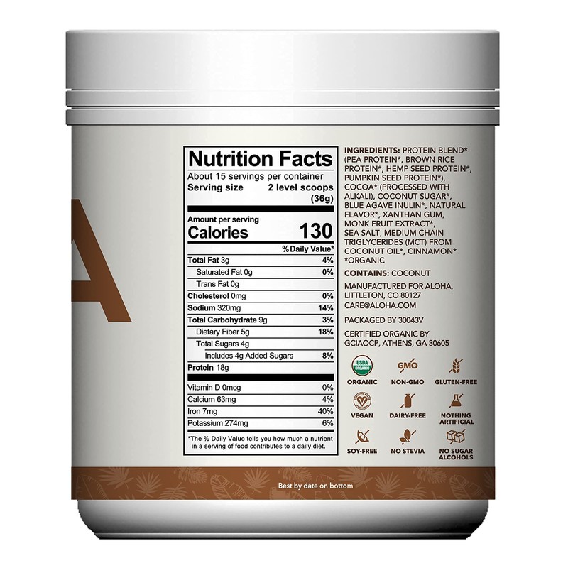 Looking for a great tasting, organic, plant-based protein boost? Alohas Chocolate Protein Powder delivers 18g clean protein per serving and features 100% recyclable packaging. This 1Lb 3oz tin of organic protein powder features classic, organic cocoa, cinnamon, and coconut sugar for a subtly sweet, protein-packed treat thats perfect for any time of day. Alohas organic plant-based protein is low in sugar and carbohydrates, free of sugar alcohols, and is a blend of organic pea, organic brown rice, organic pumpkin seed and organic hemp seed protein. Blend up this tasty protein powder into a smoothie or just shake it up with a non-dairy milk replacement for an easy, delicious, vegan snack, pick-me-up, or meal replacement. Aloha Protein Powder is Organic Certified and free of artificals, so when you add it to your shake, smoothie or other favorite, healthy recipes, you know youre getting the highest quality energy boost. Aloha Organic Protein Powder checks all the boxes: Vegan, Stevia-Free, Kosher Certified, Dairy-Free (lactose-free), Gluten-Free, Soy-Free, USDA Organic, Non-GMO, High Protein, and delicious! Aloha Organic Protein Powder is also an excellent source of fiber and iron, offers a complete amino acid profile, and includes MCT Oil from coconut for natural energy and endurance.