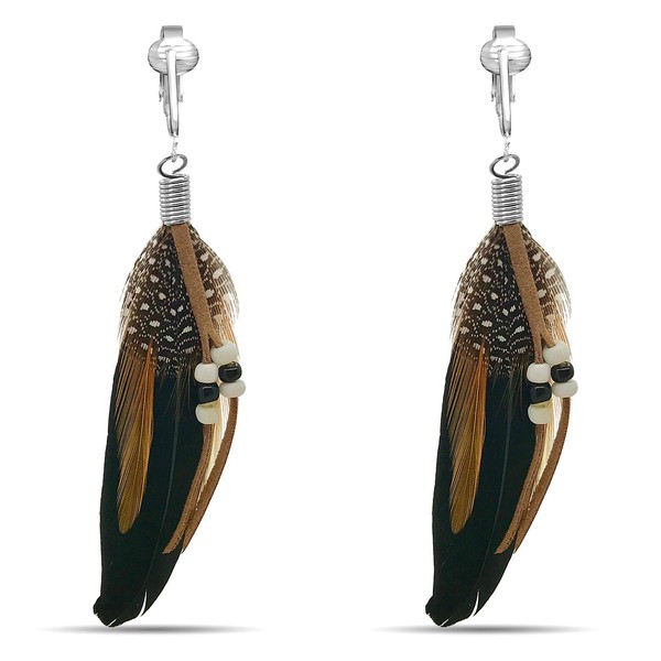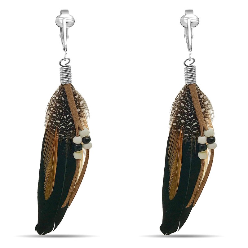 Aloha Earrings-Clip On Tassel Earrings-Dangle Clip On Earrings Silk Tassel Long Clip Earrings Bohemian (Black Feathers)