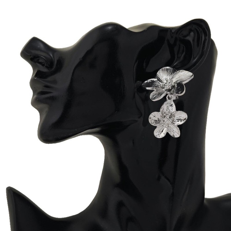 Aloha Earrings Non Pierced Silver Tone Clip On Double Flower Statement Dangling Earrings