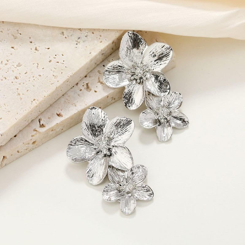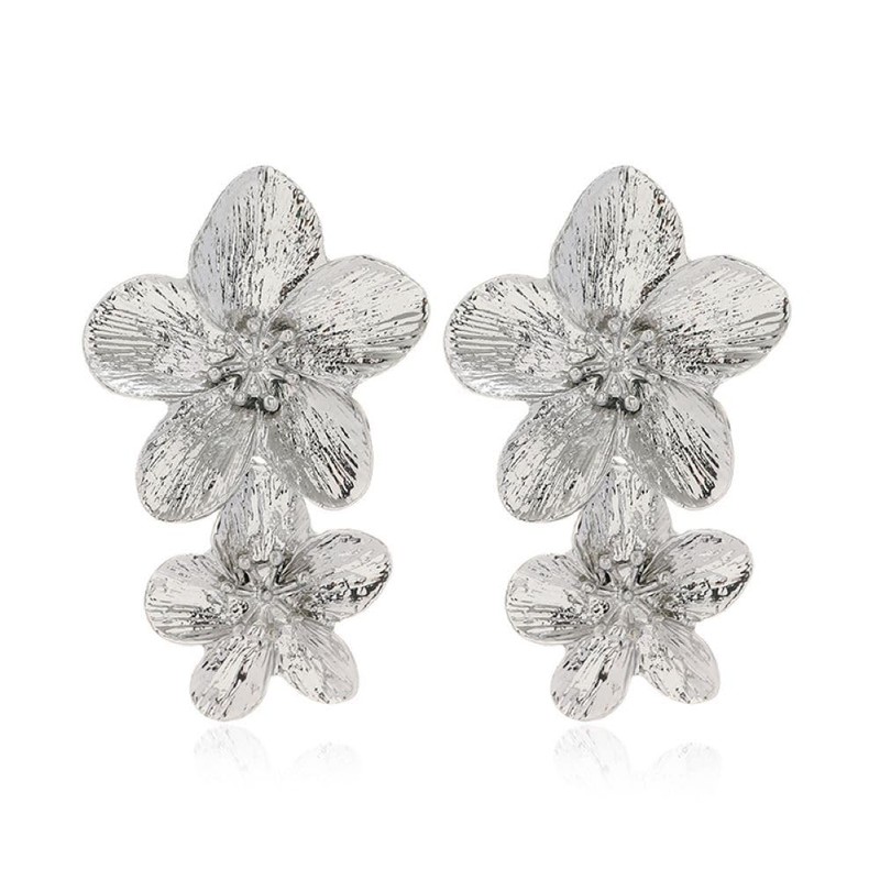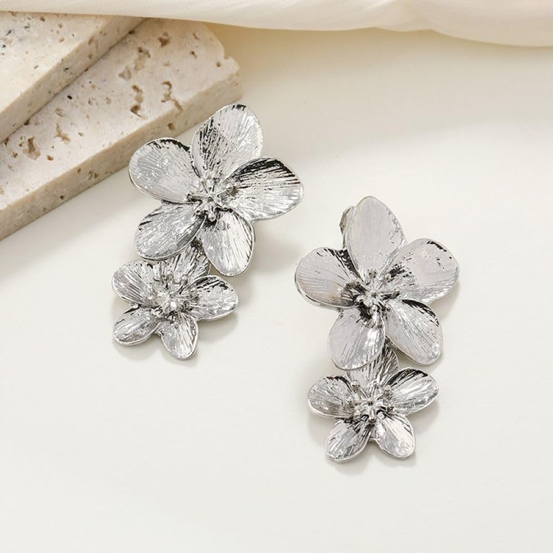 - STYLE: Non Pierced Silver Tone Clip On Double Flower Statement Dangling Earrings