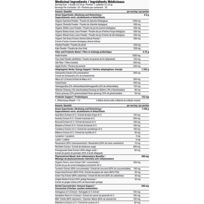 Ingredients: Green Superfoods: Alkalizng and Detoxfying- 4.5g, Organic Spinulina Powder – 1500mg, Organic Chloella Powder – 500mg, Organic Alfafa Juice Powder – 500mg, Organic Barley Grass Juice Powder – 500mg, Organic Wheat Grass Juice Powder -500mg, Organic Oat Grass Extract – 500mg, Parsley Powder – 250mg, Kale Powder – 250mg. Fruit and Vegetable Extracts & Antioxidant Support – 1.158g/Acai Berry Extract (4:1) – 150mg, Aceola Extract(4:1) – 200mg, Broccoli Extract (4:1) – 100mg, Blueberry Extract (4:1) – 100mg, Cranberry Extract (4:1) – 100mg, Bilberry Extract (4:1) – 30mg, Lycopene – 3mg, Lutein – 5mg, Resveratrol (50% transresveratrol) – 10mg, Red Beef Extract – 400mg, Pomegranate Seed Extract (40% ellagic acid)– 60mg. Phytonutrient Blend & Anti-Inflammatory Benefits – 390mg/Organic Cherry Juice Extract (36:1 concentrate) – 200mg, Tumeic Extract (95% curcuminoids) – 100mg, Grape Seed Extract (90% PCO) – 30mg, Green Tea Extract (80% catechins) – 30mg, Gingko Bilcoba Extract (24% ginkgo flavones) – 30mg. Herbal Concentrates: Immune Support- 360mg/Astagalius(4:1) Extract – 100mg, Dandelion Root (4:1) Extract - 100mg, Milk Thistle (80% Silymarin) – 100mg, Elderberry Extract (4:1) – 60mg. Adaptogenic Herbs Energy Support- 1.355g/ Schizandra Extract (2% schizandrin) – 200mg, Maca (4:1) Extract – 500mg, Dulse – 400mg, Ashwagandha (2% withanolides) - 125mg, Siberian Ginseng (8% eleuthosides) – 80mg, Panax Ginseng (10% ginsenosides) – 50mg. Probiotic support - 133mg/ L Rhamosus (Rosell – 11) 5 Billion Active Cells. Fiber and Prebiotic Blend- 2.75g/ Inulin – 1000mg, Flax Seed Powder (defatted) – 750mg, Oat Fiber – 500mg, Apple Pectin – 500mg, Non- Medicinal Ingredients: Natural Fruit Punch Flavor, Stevia, Malic Acid, Citric Acid.