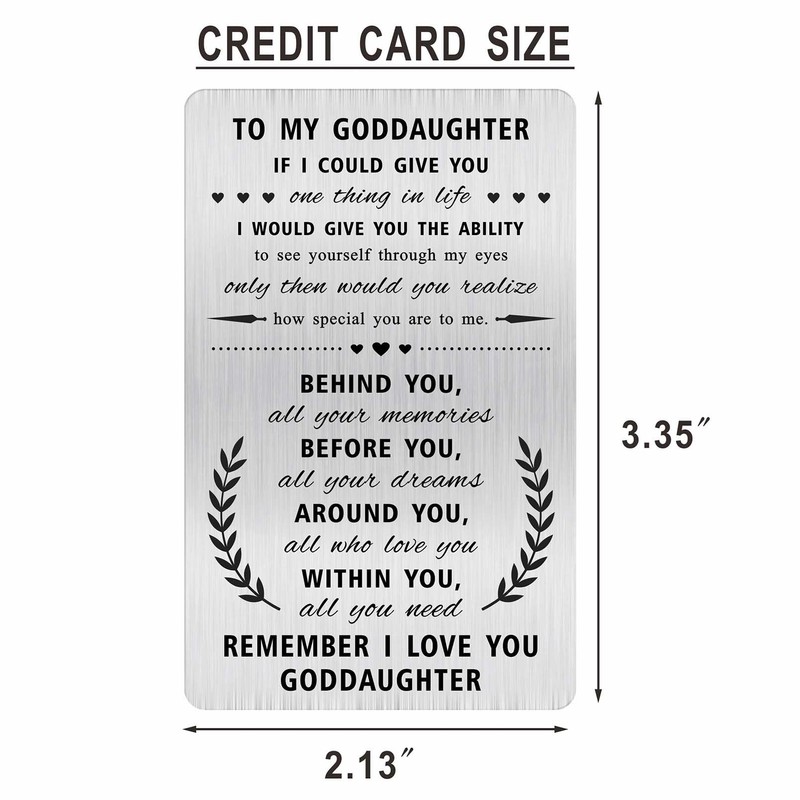 - to my goddaughter, If I could give you one thing in life, I would give you the ability to see yourself through my eyes, only then would you realize how special you are to me. Behind you, all your memories. Before you, all your dreams. Around you, all who love you. Within you, all you need. Remember I love you goddaughter