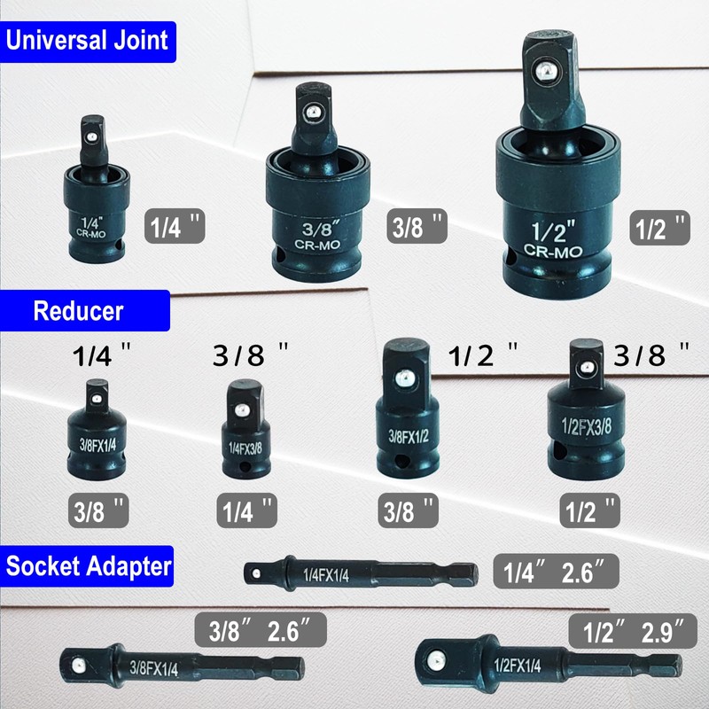 - WIDELY APPLIED: The socket adapter kit includes various adapters we sell, which you can mix and match on drivers, wrenches, and ratchet wheels to create infinite possibilities according to your needs and solve your problems. Very suitable for car repair, home maintenance tasks, DIY projects, and home decoration projects.