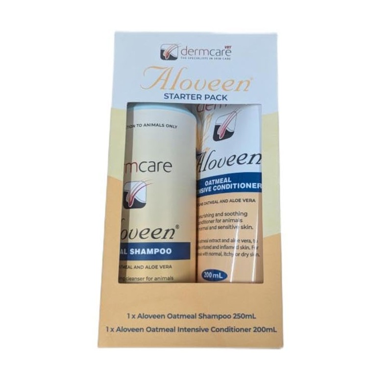 - Cleanse and moisturise with this great ALOVEEN Starter Pack, it contains both the ALOVEEN oatmeal shampoo and ALOVEEN intensive conditioner. ALOVEEN shampoo contains a gently cleansing shampoo base, which removes dirt, chemicals and allergens from the coat without irritating the skin. The oatmeal soothing properties are specifically indicated for animals with itchy, dry skin. ALOVEEN intensive conditioner is a unique, concentrated residual conditioner, specifically designed as a leave on products for deeper conditioning, and to prolong the soothing effects of ALOVEEN shampoo. Pack includes: 250ml ALOVEEN Oatmeal Shampoo and 200ml ALOVEEN Intensive Conditioner.