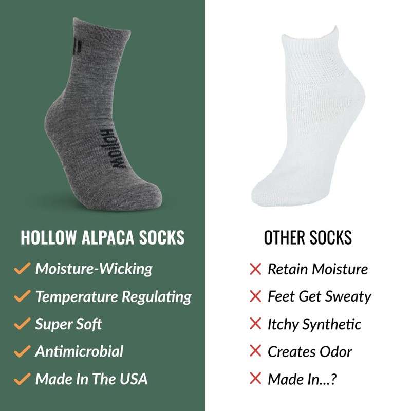 - FOR EVERY ACTIVITY: Softer and stronger than most other materials typically found in socks, alpaca fiber continues to prove it can withstand a wide range of activities and adventures. Whether you’re looking for hiking socks, hunting socks, running socks, thermal socks, warm socks, winter socks, ski socks, or just a pair of cozy socks for work or relaxing - the benefits of Hollow alpaca socks will keep your feet comfortable.