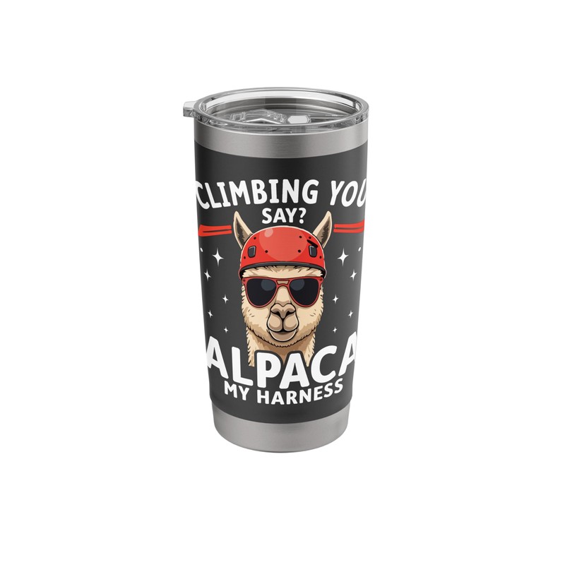 - This design features an adventurous alpaca rocking a red helmet and sunglasses, adding a playful twist to any outdoor enthusiast's wardrobe. The humorous phrase "Climbing You Say? Alpaca My Harness" emphasizes the alpaca’s cool and confident vibe, making i