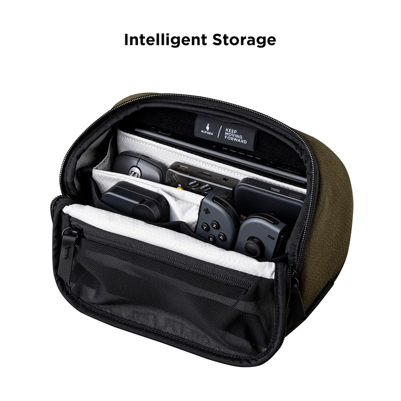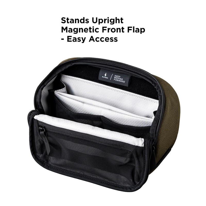The ALPAKA Vertex Pouch Mini transforms how you carry and organize your essential electronics with its revolutionary 3-in-1 design that functions as a crossbody sling bag, packable tech storage, and desktop caddy. Crafted from durable Axoflux 300D fabric with YKK AquaGuard waterproof zippers, this ultra-compact 2L pouch delivers superior water resistance while maintaining an incredibly lightweight 0.8LB profile. The magnetic fold-down front flap encourages effortless one-handed access, while the soft-lined device sleeve securely holds e-readers, game switch or larger smart phones.. A flexible internal divider, plus 2 mesh slip pockets keep cables and accessories perfectly organized, and the front flap pass-through allows charging without opening the main compartment. Detachable padded strap with Maglockz clips ensures all-day comfort whether worn crossbody or carried by the convenient grab handle. At just 5.9” H X 9.3” W X 3.2” D, it stands upright on any surface and integrates with ALPAKA's HUB accessory ecosystem for unlimited customization possibilities.