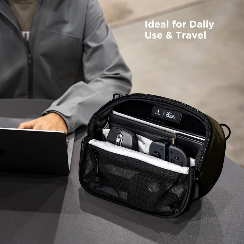 • ERGONOMIC MULT-USE DESIGN: Versatile 3-in-1 solution combining crossbody sling bag, packable EDC tech storage and portable desktop caddy in one compact package. Detachable padded shoulder strap with Maglockz clips provides all-day comfort with easy on/off access. The convenient grab handle transforms it into a portable EDC pouch. A reinforced bottom allows stable upright standing and the *small 2L profile fits easily into backpacks or luggage.